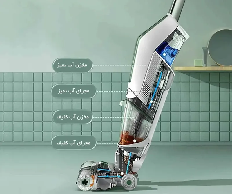 باتری لیتیوم یونی 25.2 ولتی دستگاه پس از حدود 4 ساعت شارژ کامل، تا 30 دقیقه عملکرد مداوم ارائه میدهد که برای نظافت روزمره کاملاً مناسب است. وجود دو مخزن مجزا برای آب تمیز (600 میلیلیتر) و آب کثیف (550 میلیلیتر) باعث میشود فرآیند شستشو کاملاً بهداشتی و بدون ترکیب آب آلوده انجام شود.