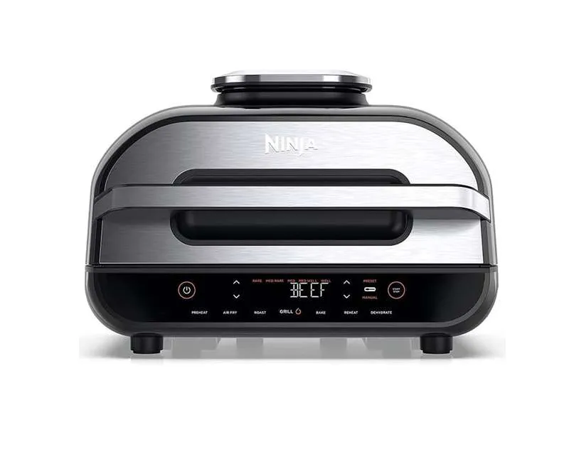 سرخ کن و گریل نینجا مدل AG551، سرخکن و گریل نینجا مدل AG551 دستگاهی قدرتمند با توان ۲۴۶۰ وات است که امکان پخت انواع غذاها را با حداقل روغن یا حتی بدون روغن فراهم میکند و با بهرهگیری از سیستم گردش هوای سریع، غذاهایی ترد و مغزپخت با چربی کمتر آماده میسازد. بدنه این دستگاه از ترکیب استیل و پلاستیک فاقد BPA ساخته شده و با طراحی عایق سرد، ایمنی بالایی هنگام کار دارد. نمایشگر دیجیتال و پنل لمسی روی بدنه، انتخاب ۶ برنامه پخت شامل Air Fry، گریل، Roast، Bake، Dehydrate و گرمکردن مجدد را آسان کرده و تنظیم دما و زمان را در اختیار کاربر قرار میدهد. فناوری گریل سیکلونیک با ایجاد حرارت تا ۲۶۰ درجه سانتیگراد و گردش هوای یکنواخت، پخت حرفهای بهویژه برای استیک در ۵ سطح مختلف را تضمین میکند. کاسه مربعی ۳.۸ لیتری با روکش نچسب، سبد کریسپر سرامیکی، ظرف پخت، صفحه گریل، پروب هوشمند سنجش دما و برس نظافت از لوازم جانبی کاربردی این مدل هستند. امکاناتی مانند تایمر، خاموشی خودکار، هشدار پایان برنامه، پایه ضدلغزش و محفظه جمعکردن سیم نیز کاربری راحت و ایمن دستگاه را تکمیل میکنند. برای خرید و استعلام قیمت سرخ کن و گریل نینجا مدل AG551 میتوانید با کارشناسان فروشگاه اینترنتی پنکه تماس بگیرید.