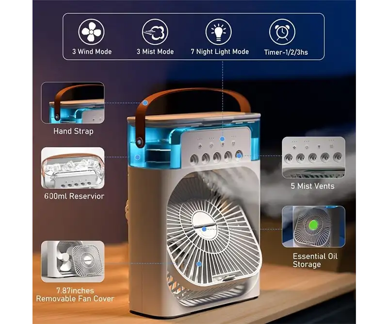 - دارای ۵ نازل بخور سرد - دارای چراغ خواب RGB - دارای تایمر ۳ حالته - ۳ حالت میزان باددهی - دارای مخزن خوشبو کننده هوا - دارای مخزن آب ۶۰۰ میلی لیتر برای افزودن آب یخ